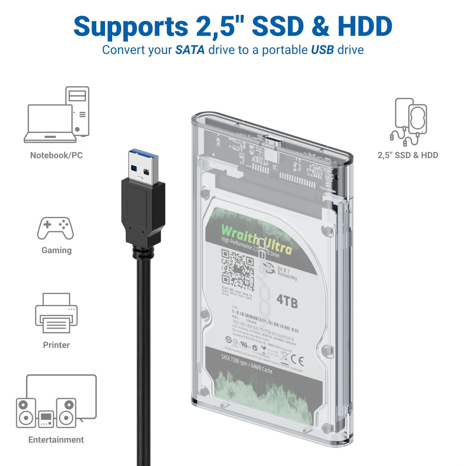 - Für alle gängigen 2,5" Zoll HDD und SSD mit 7mm & 9,5mm Höhe