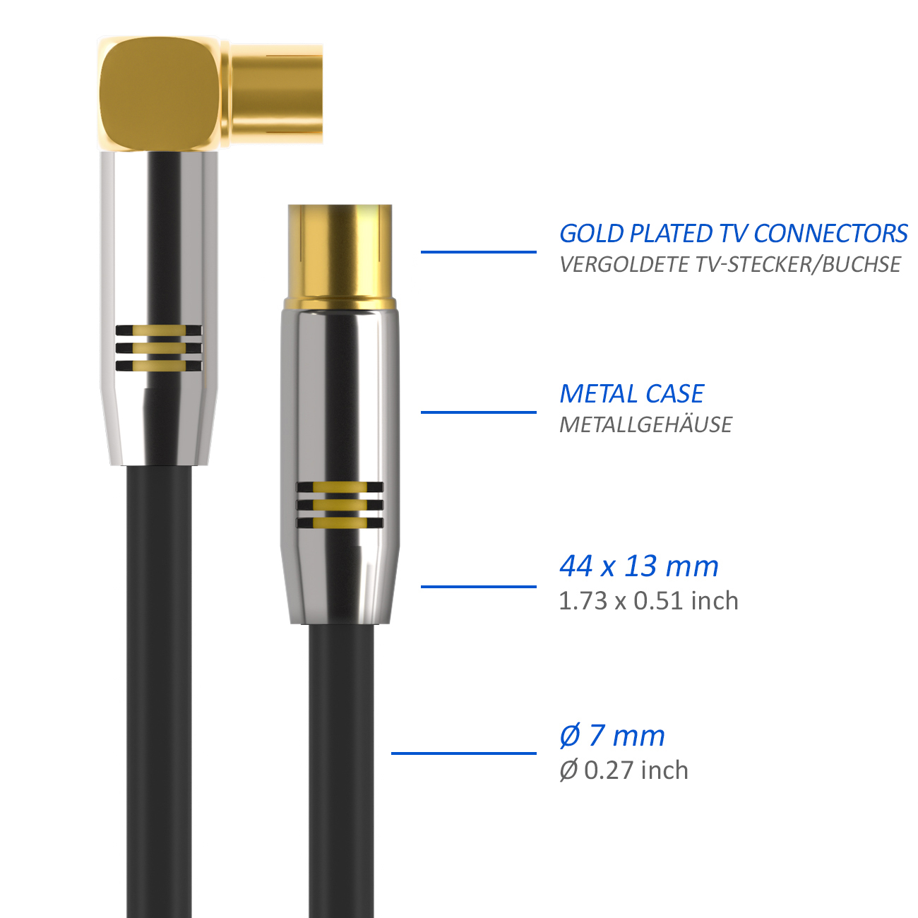 - TV-Stecker zu TV-Buchse - [1x 90° Winkel-Stecker] - (Belling-Lee- / IEC- Stecker / -Buchse)