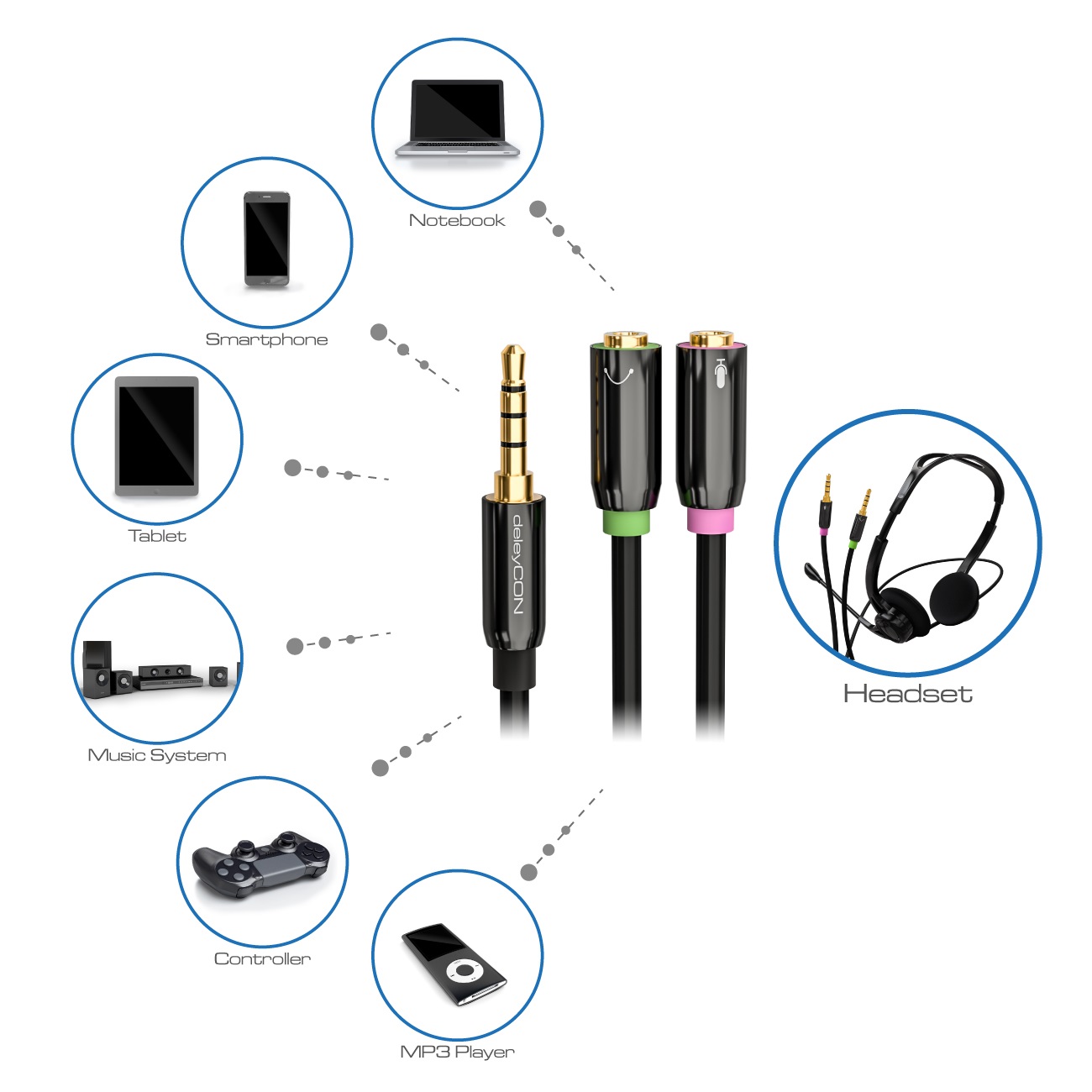 Mit dem hochwertigen deleyCON Stereo Audio Klinken Y Adapter Kombi Kabel können z.B. Headsets , Kopfhörer und Mikrofone an eine einzelne 3,5mm Klinken Kombi Buchse angeschlossen werden. Headsets und Gaming Headsets mit getrenntem 3,5mm Klinken Anschluss für Kopfhörer und Mikrofon können so mit einer einzelnen Klinken Kombi Buchse verbunden werden.