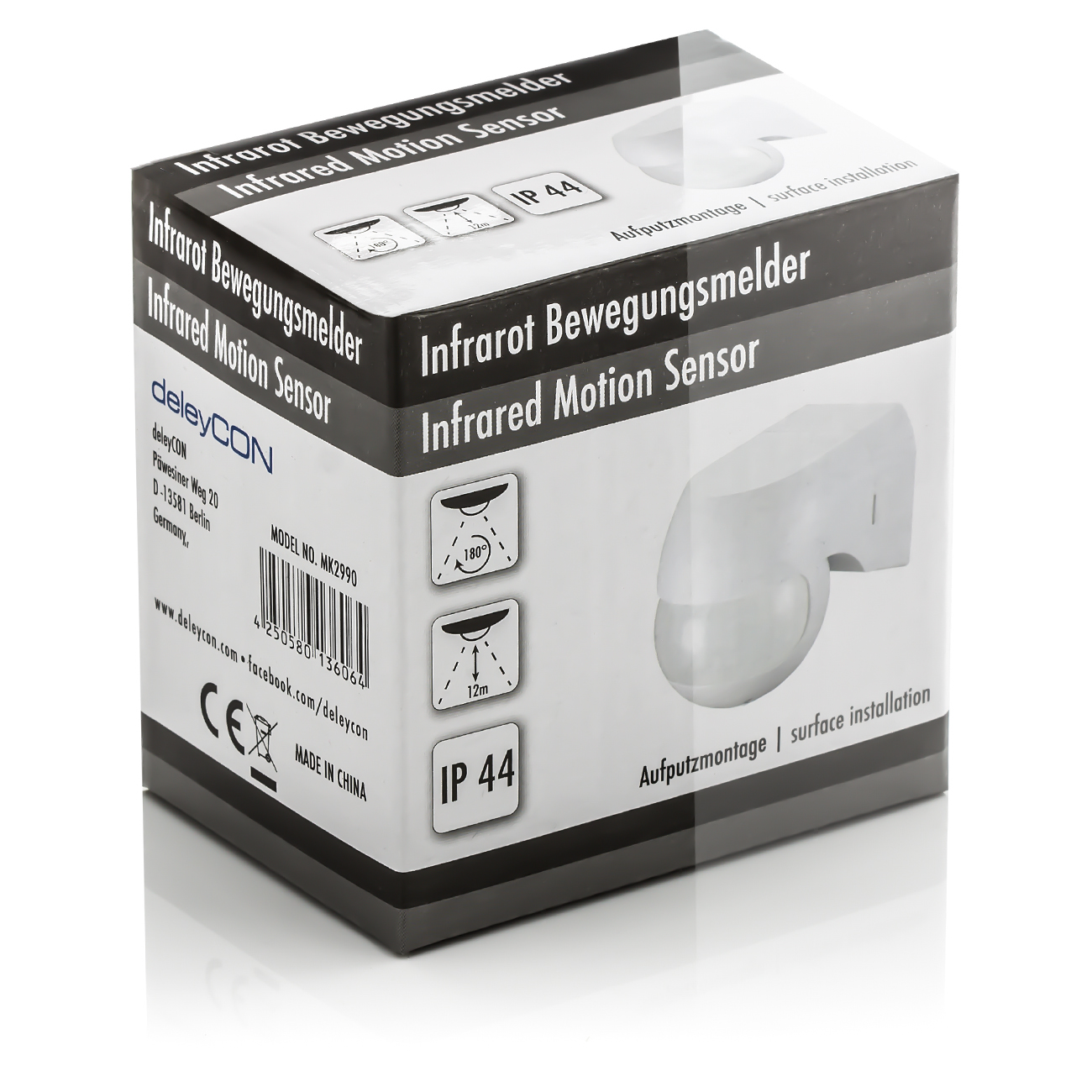 deleyCON Infrarot Bewegungsmelder - Innen/Außen IP44 - 180° bis 12m - Weiß