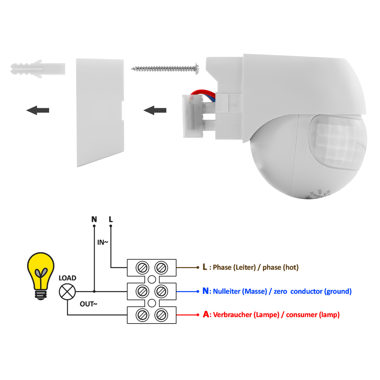 Lieferumfang: Infrarot Bewegungsmelder + Betriebsanleitung + Schrauben mit Dübeln
