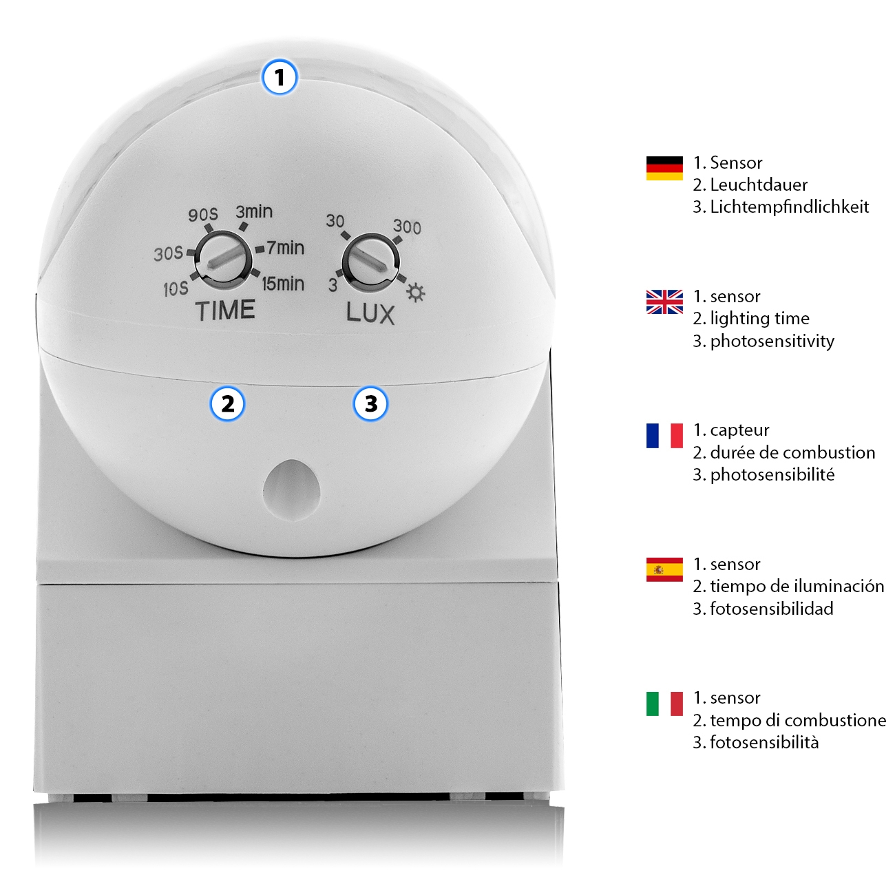 Über einen Regler kann die Umgebungshelligkeit bestimmt werden, bei welcher der Bewegungsmelder eingeschaltet wird.