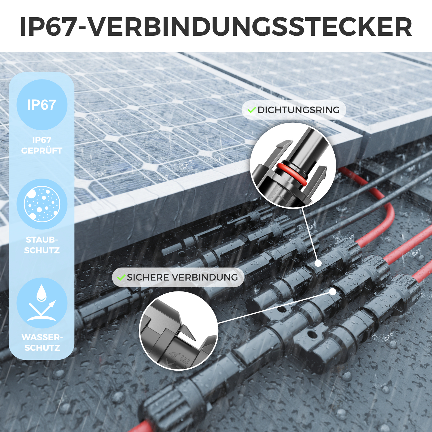 Das PV4 Solar Y Stecker Paar ist die ideale Lösung zur Parallelschaltung von Photovoltaik-Modulen. Mit einem Set aus zwei Adaptern – einem 1-fach Stecker auf 3-fach Buchse und einem 3-fach Stecker auf 1-fach Buchse – ermöglichen diese PV4-Verteiler eine effiziente Verbindung mehrerer Solar-Panels. Dank der robusten Bauweise mit IP68-Schutzart sind die Stecker wasserdicht und für den Einsatz in anspruchsvollen Umgebungen geeignet. Diese PV4-Adapter sind für hohe Ströme und Spannungen bis zu 1500V ausgelegt und gewährleisten eine sichere und zuverlässige Stromübertragung. Die Adapter entsprechen internationalen Normen und bieten höchste Qualität und Langlebigkeit für Ihre Solaranlage.