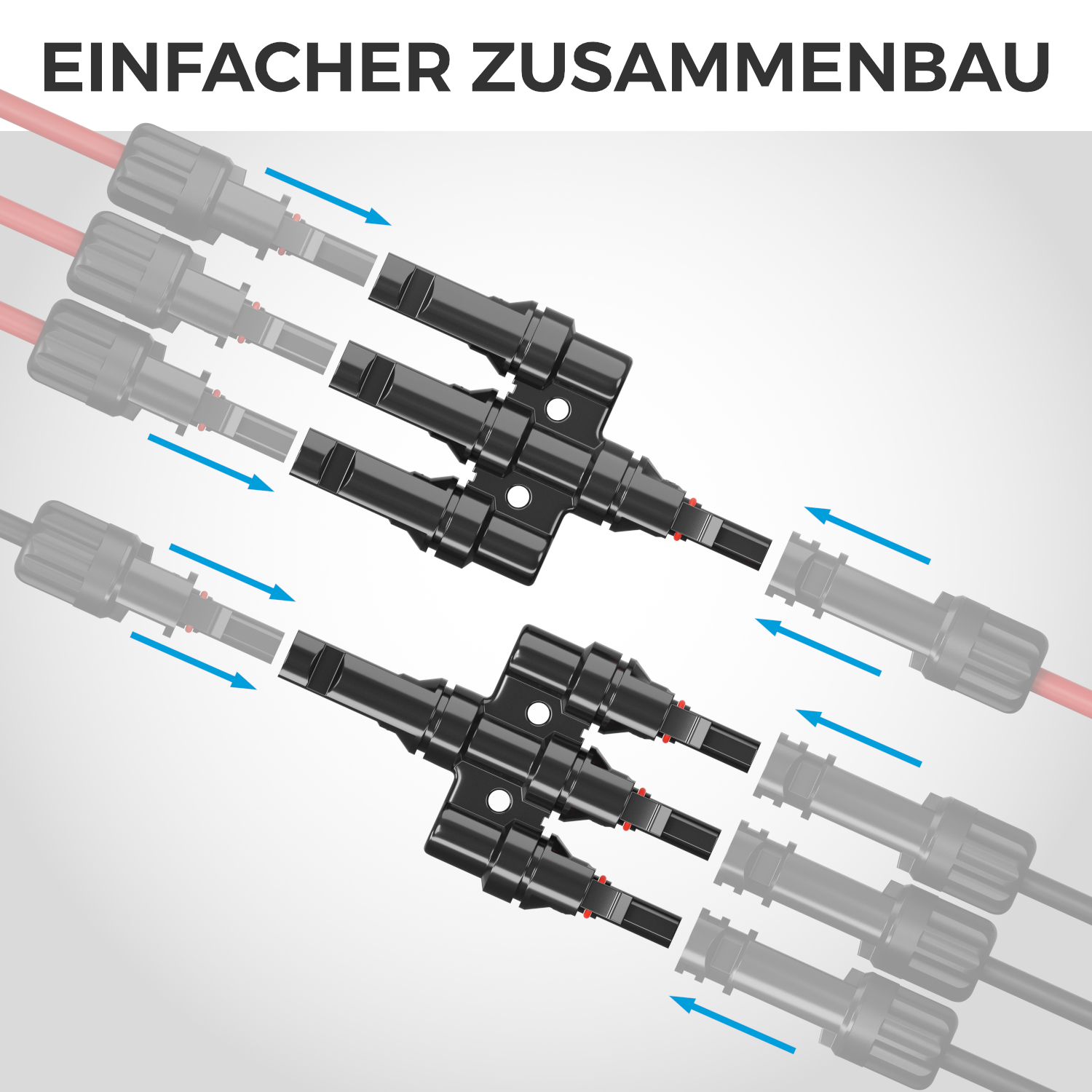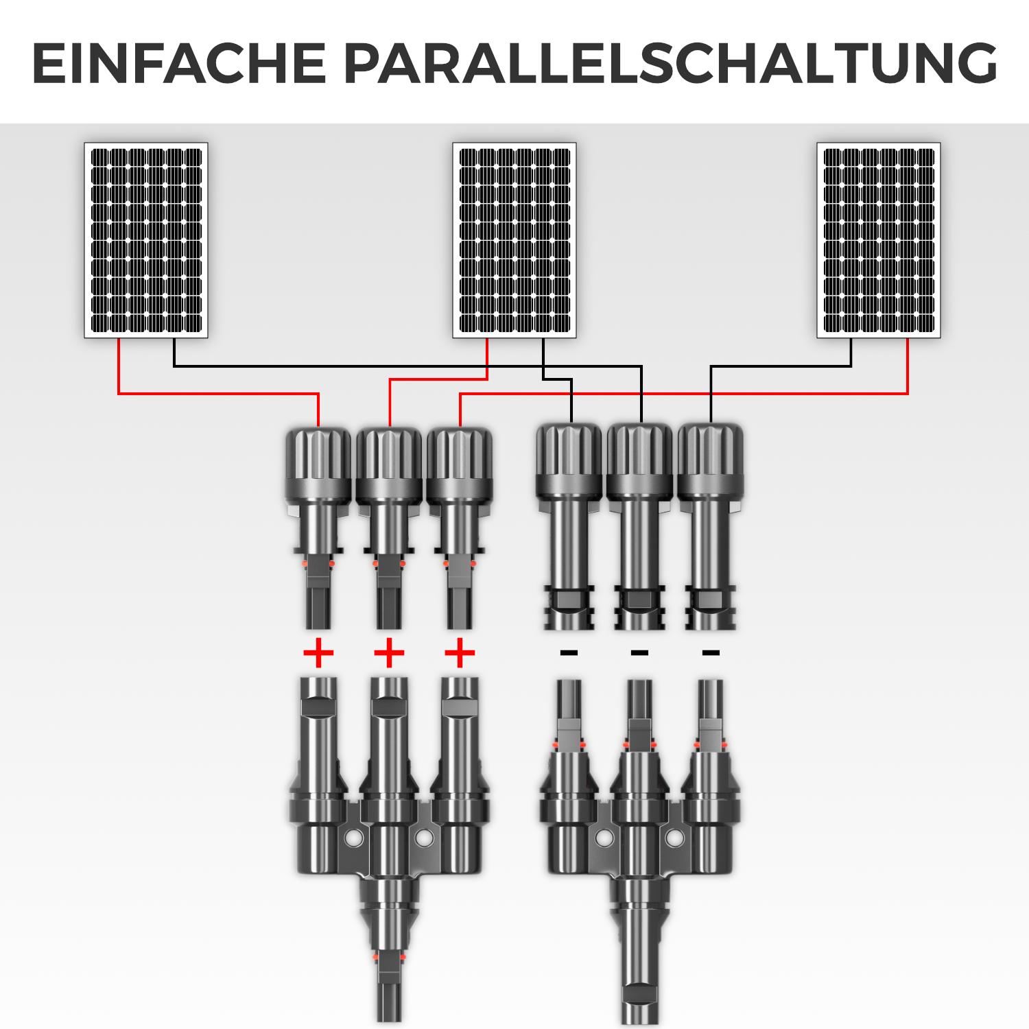 Die PV4 Solar Y Stecker eignen sich hervorragend für den Einsatz in Solaranlagen, bei denen mehrere Photovoltaik-Module parallel geschaltet werden müssen. Ob im privaten oder gewerblichen Bereich – diese Verteiler bieten eine sichere und einfache Lösung für die Installation und Erweiterung von Solarmodulen.