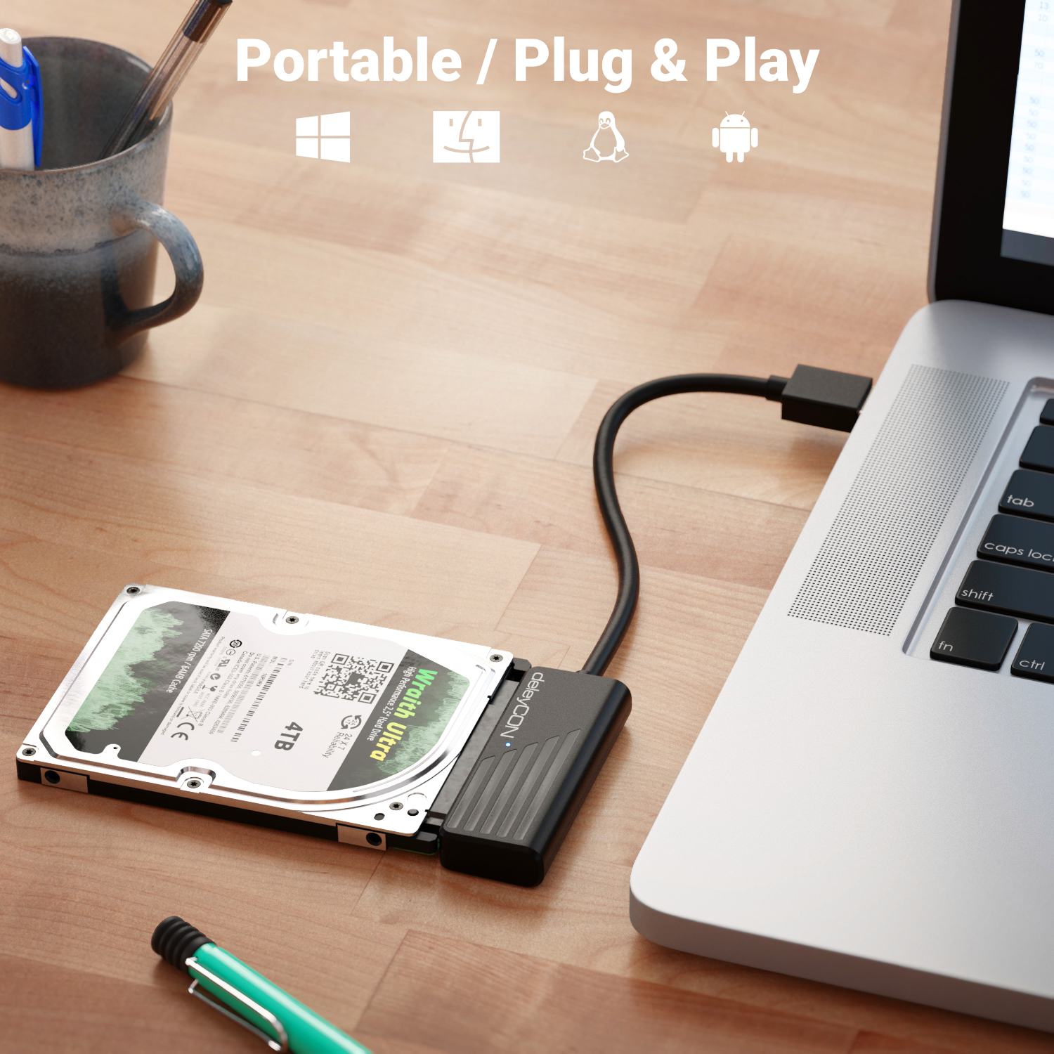 Das deleyCON Adapterkabel einfach an eine 2,5-Zoll-Festplatte HDD/SSD anschließen. Den USB 3.0-Anschluss an einen USB-Anschluss des Computers, Laptop, Notebook etc. anschließen.