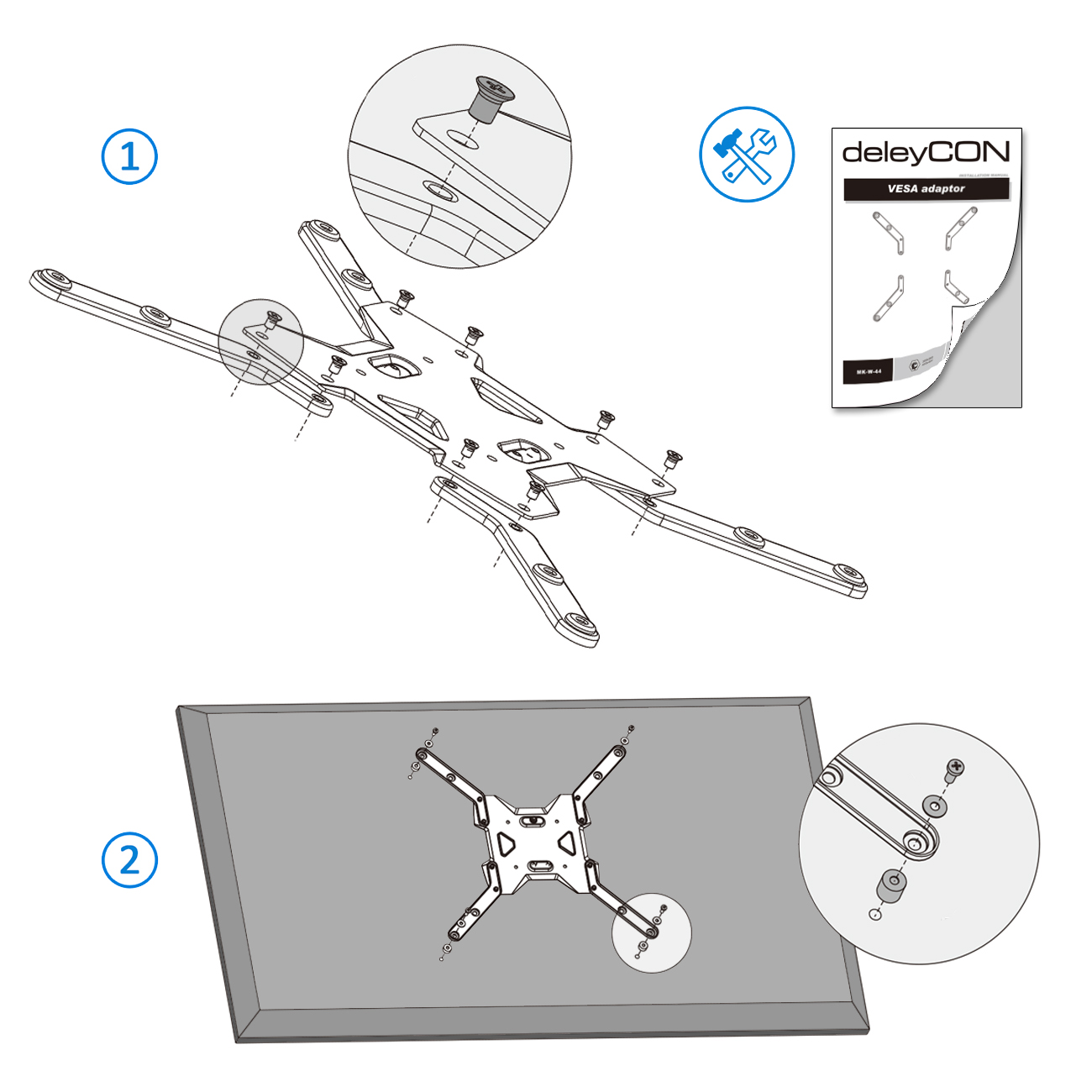Mit den deleyCON VESA Adaptern können Sie Ihre vorhandenen Geräte auf einen größeren VESA Standard adaptieren.