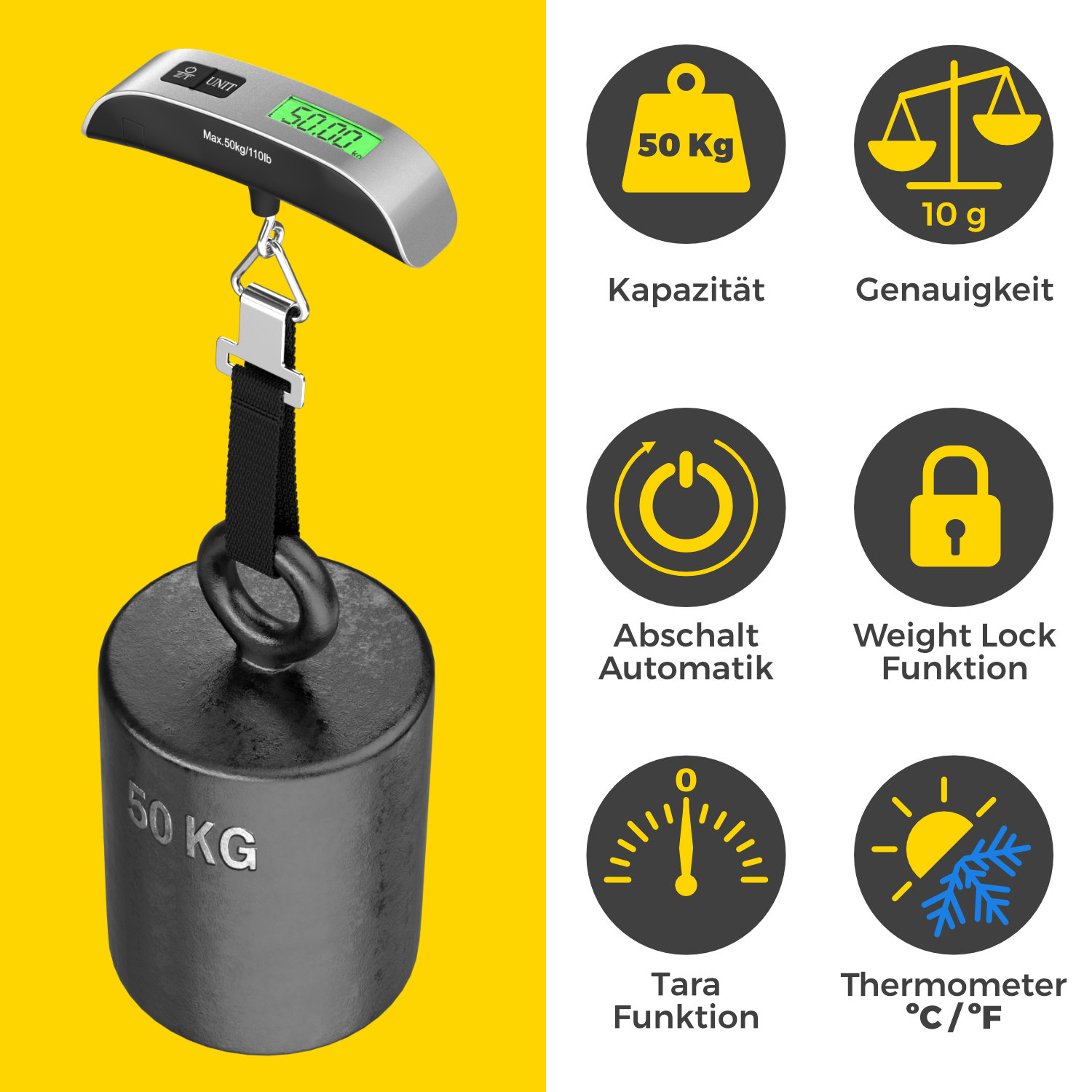 - Maximales Hebegewicht: 0,1 kg bis 50 kg (± 10 g)