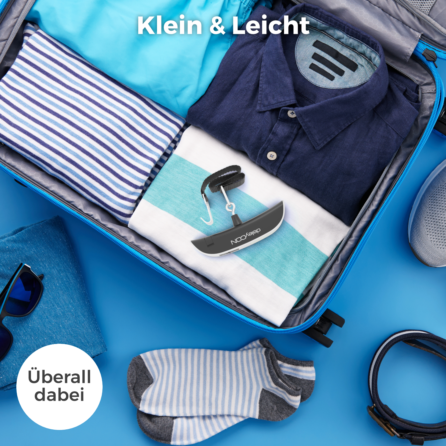 Die deleycon digitale Kofferwaage ermöglicht präzise Gewichtskontrollen bis 50 kg und schützt vor Übergepäckgebühren. Das beleuchtete LCD-Display zeigt Gewicht und Raumtemperatur in °C oder °F auf einen Blick. Dank der praktischen Tara-Funktion lassen sich auch kleine Gegenstände exakt wiegen. Das robuste ABS-Gehäuse sorgt für Langlebigkeit, während das handliche Format in jede Reisetasche passt. Mit nur einer CR2032-Batterie (inklusive) ist die Waage sofort einsatzbereit.